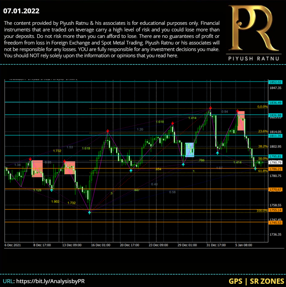 UP TREND : 1796 – 1808 – 1818 – 1832 - Gold price is trying to make a fading recovery attempt from eleven-day lows of $1,786 reached on Thursday, as bears take a breather ahead of the all-important US Nonfarm Payrolls release. A solid NFP publication is likely to back the speculation around aggressive Fed rate hikes, boosting the Treasury yields and the US dollar once again at gold’s expense. Meanwhile, gold price could benefit from profit-taking in the dollar ahead of the key event risks. The improving market mod weighs down on the safe-haven greenback, aiding the recovery in the bright metal, for now.Technically, gold price remains vulnerable as it has taken out all the major Daily Moving Averages (DMA), with the downside exposed towards $1,775 should the December 21 low of $1,785 give way.Major media portals, analysts are indicating a crash in GOLD prices till the level of $1750 justifying through statements like: “Prices of the yellow metal accelerated their losses on Thursday. The leg lower came amidst increasing open interest and volume, which should be supportive of the continuation of the downtrend in gold, at least in the very near term. That said, the next target of note comes at December’s low at $1,753 per ounce troy (December 15).”